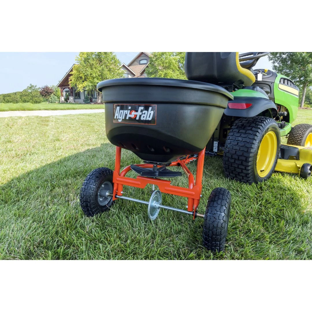 - Tow behind broadcast spreader/ Attaches to any riding mower/ Pneumatic tires/ Poly hopper and spreader plate/ Open gear box with heat treated sproket and cog/ On-off control with solid rod connector accessible from tractor seat/ 3 year Limited Warranty