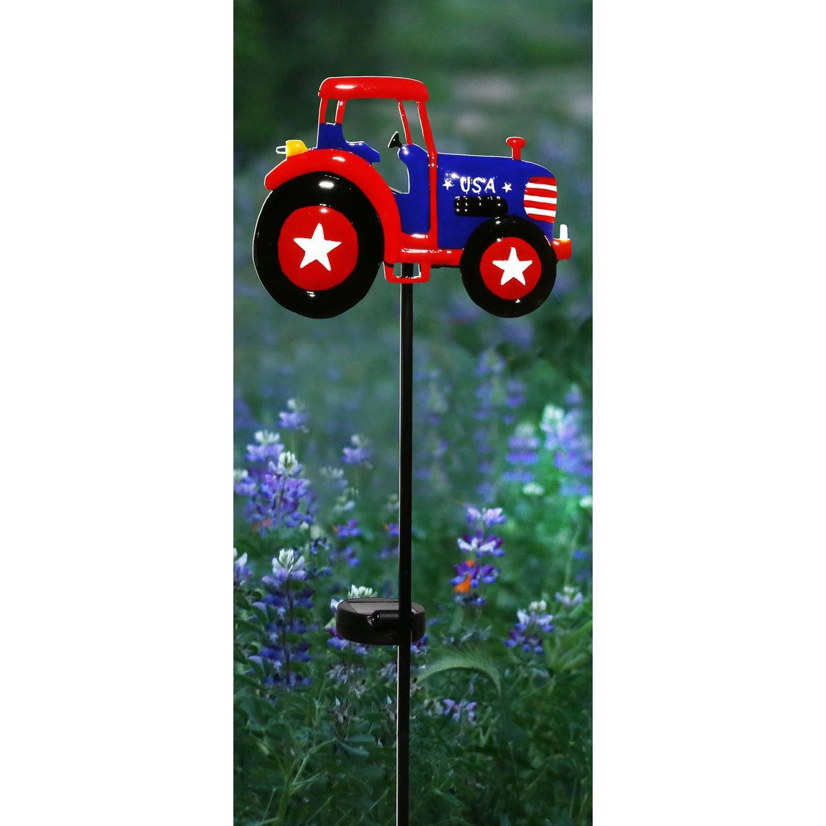 - PATRIOTIC DECOR: Metal tractor in vivid red, white and blue illuminates in the evening to create farm-inspired accent day and night