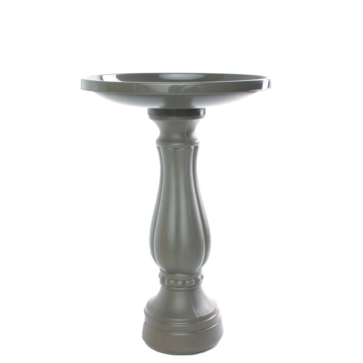 DESIGNER COLLECTION by Bloem: Welcome feathered friends into your garden with this Bloem birdbath, which brings timeless beauty to your outdoor space. Perfect for your garden or near your favorite gathering spot, it features a 17-inch diameter basin with a gradual 2″ slope depth which makes it very easy for birds to splash in and enjoy. Measures 17 inches in width by 25 inches height. Blow molded pedestal features a hallow core and water-tight base. Fill pedestal with sand for added stability year-round. Bird bath basin attaches in seconds with three (3) all-weather screws (included). Made in USA.