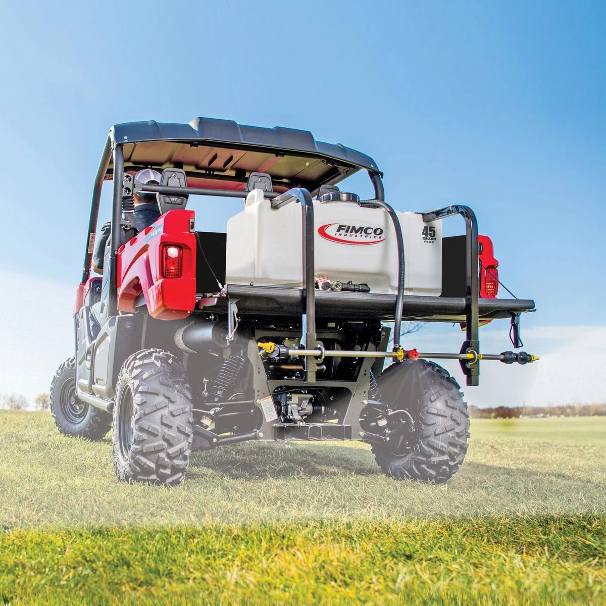 The FIMCO 45 Gallon UTV Sprayer 4.5 GPM Boomless is designed to work with UTV, lawn tractors and larger zero turn mowers. The UV resistant, molded polymer tank has a 5 inch tethered lid for easy access and is completely drainable. This model features the best in class High Flo High Performance 4.5 GPM Pump with inline fuse protection. The Deluxe Pistol Grip Handgun distributes up to 40 feet horizontal spray, 28 feet of vertical spray and comes with 25 feet of 3/8 inch hose. The 3 Nozzle boom offers 36 feet of total spray coverage and our FIMCO exclusive manifold conveniently places pressure control and boom operation at your fingertips to fine tune your spray pattern.