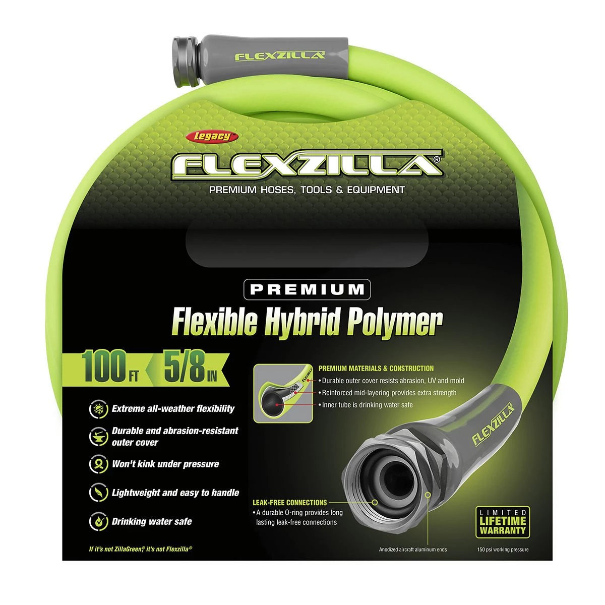 Flexzilla Garden Hose is engineered with a Flexible Hybrid Polymer that is both lightweight and durable. This premium hose redefines flexibility and is easy to maneuver around your yard. Flexzilla Garden Hose has zero memory which allows the hose to lay flat and ensures that sprinklers stay put without twisting. Its durable outer cover is abrasion-resistant, and the reinforced mid-layering provides extra strength. Plus, with our superior O-ring, you get a long-term, leak-free connection at the spigot. The Flexible Hybrid Polymer inner tube material is drinking water safe.