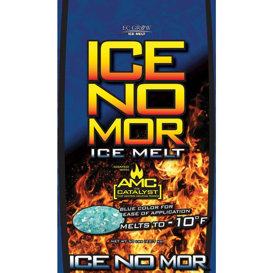 Ice No Mor brand granular ice melt is a medium sized granular particle de-icing blend of sodium chloride, calcium chloride, and magnesium chloride plus AMC. Ice No Mor is an ice melter specifically formulated for high performance melting. It will eliminate the worst ice and snow quickly and to temperatures as low as -10 F. Ice No Mor contains AMC, calcium chloride, and magnesium chloride, which work quickly to form an ice melting brine. This brine is essential for fast melting action at low temperatures. After Ice No Mor capitalizes on the fast acting materials within the blend, it then turns to sustained melting for hours after application. Ice No Mor works for extended periods of time, reducing the need to reapply product. Ice No Mor is also dyed blue, making it easy to see where the product has been placed. Ice No Mor delivers deicing speed, performance, safety, and reliability