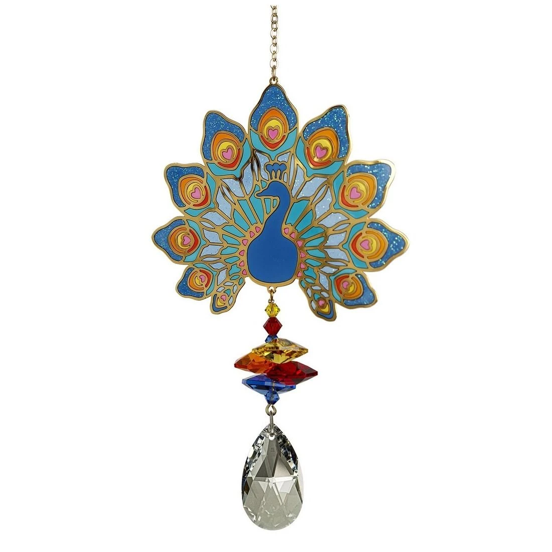 Featuring a stained glass effect with gold metal outlines filled with a translucent resin that allows light to shine through, our Crystal Wonders look the same from both sides. When hung in a window with the light streaming in, these colorful ornaments are breathtaking. Peacocks symbolize different things in various cultures. One theme common to all is that the “eyes” in the bird’s tailfeathers represent watchfulness, protection, vision and pride or self-worth. It’s also said that peacocks can predict rain, as they dance when they sense a storm coming. Our Crystal Wonders – Peacock can predict the weather, as well – when the sun is shining through its “stained glass” panels, it’s sure to be a beautiful day.