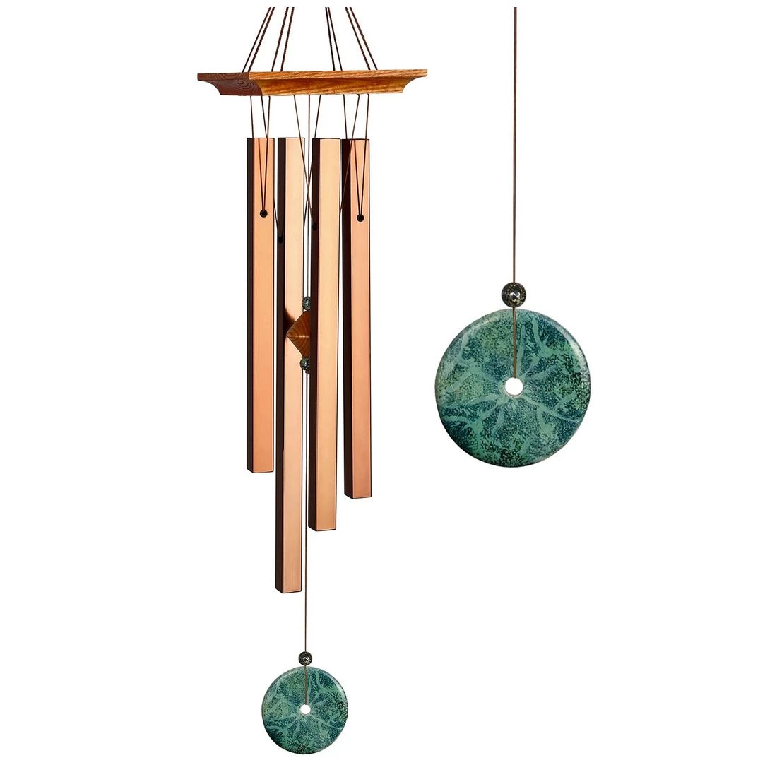 The enchanting sound of this wind chime is the result of a special tuning using the “Golden Ratio” This ratio, discovered by the ancient Greeks, can be found throughout nature. Turquoise gets its beautiful blue-green color from copper and aluminum. It is a process that takes tens of millions of years. In many Native American languages, the translation for the word turquoise is “sky-stone” The color turquoise contains the growth quality of green and the communication quality of blue. Inspired by the rich beauty of this attractive union, we blended colorful beads with a faux turquoise windcatcher to create our beautiful Turquoise Chimes.