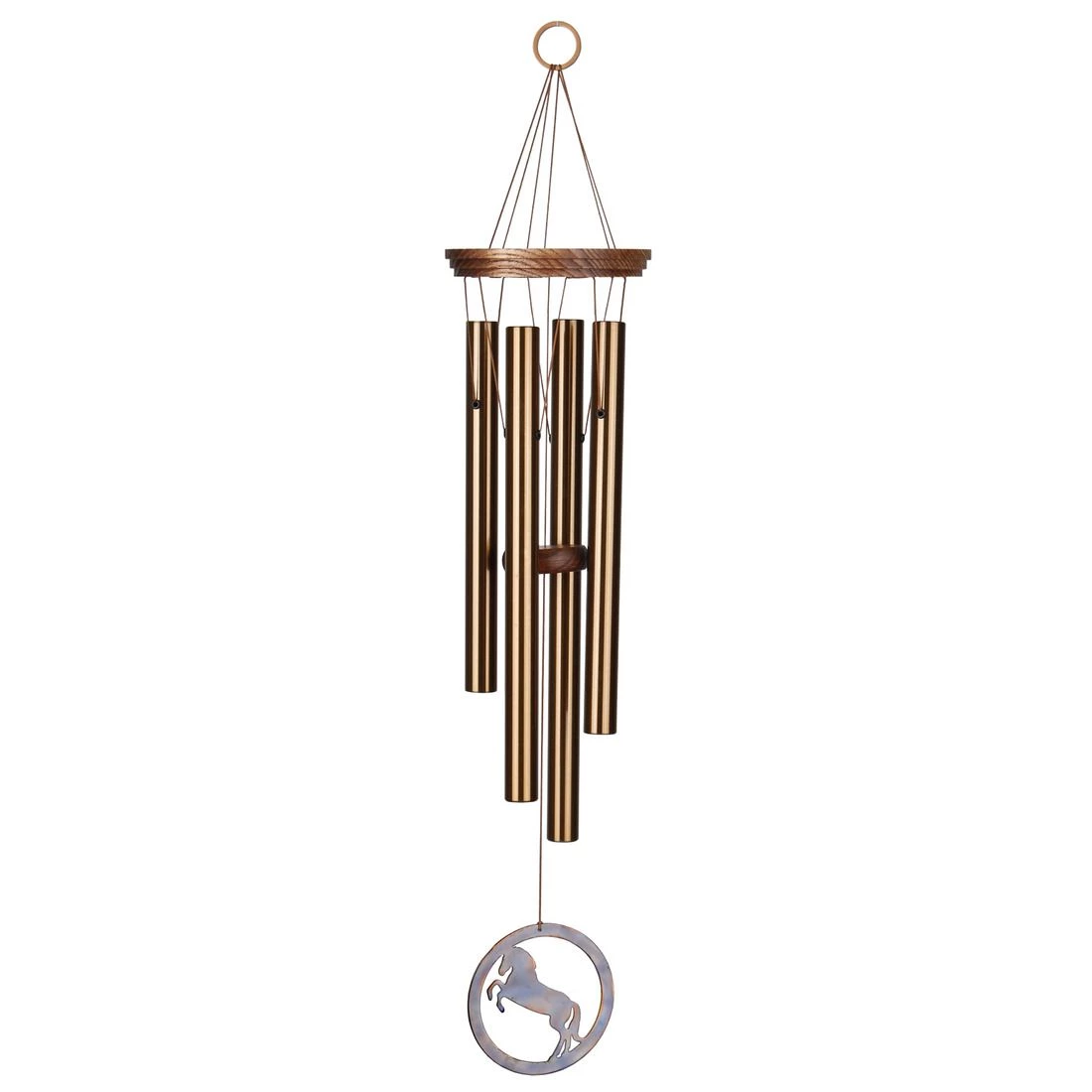 Tuned to the notes of the First Call, heard at the start of horse races. Humans began domesticating horses around 4000 BC. Today we interact with horses in a number of ways: riding them for entertainment, using them as therapy animals, as farm workers, and, of course, racing them for sport. And they’re off the familiar bugle call that signals the start of a horse race serves as the scale to which this wind chime is musicallytuned. The rearing horse silhouette is cut from a single piece of stainless steel that has been treated with a flamed finish, producing wonderful burnished, coppery colors.